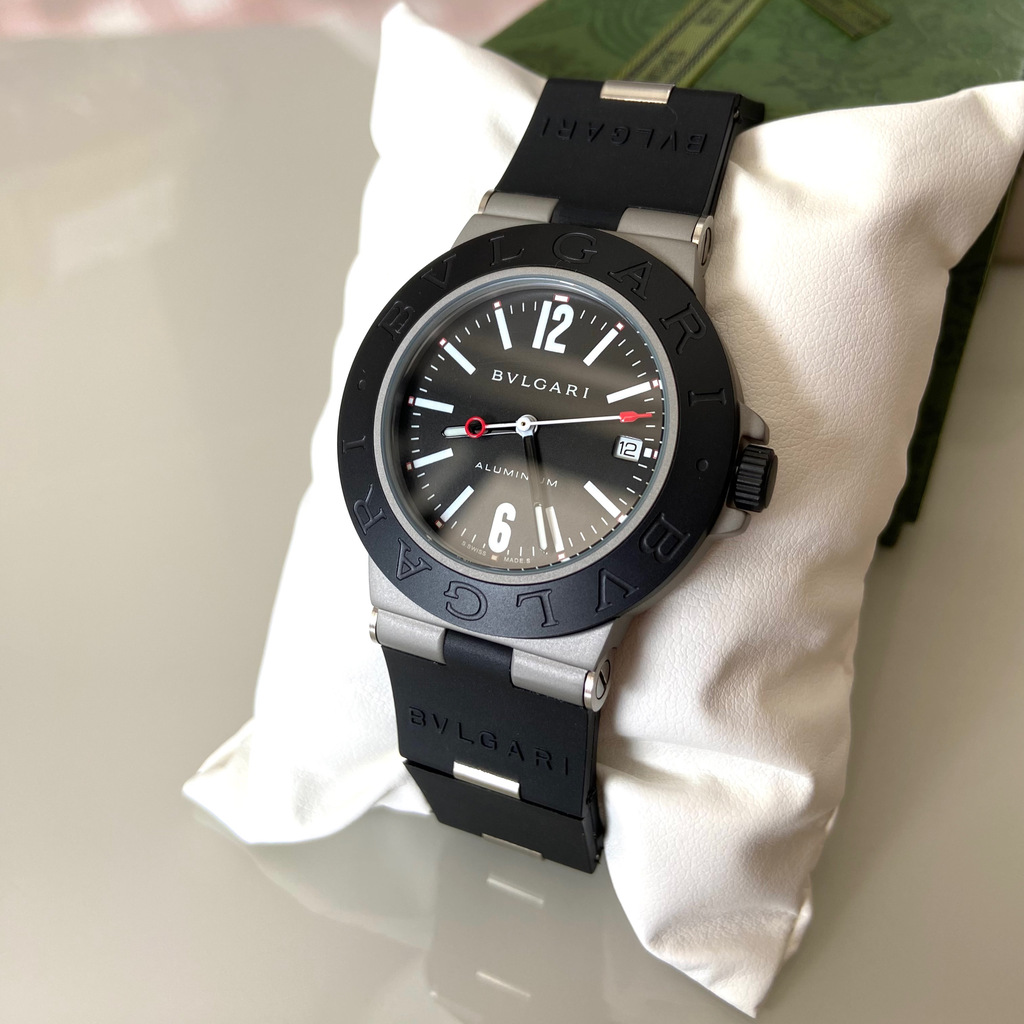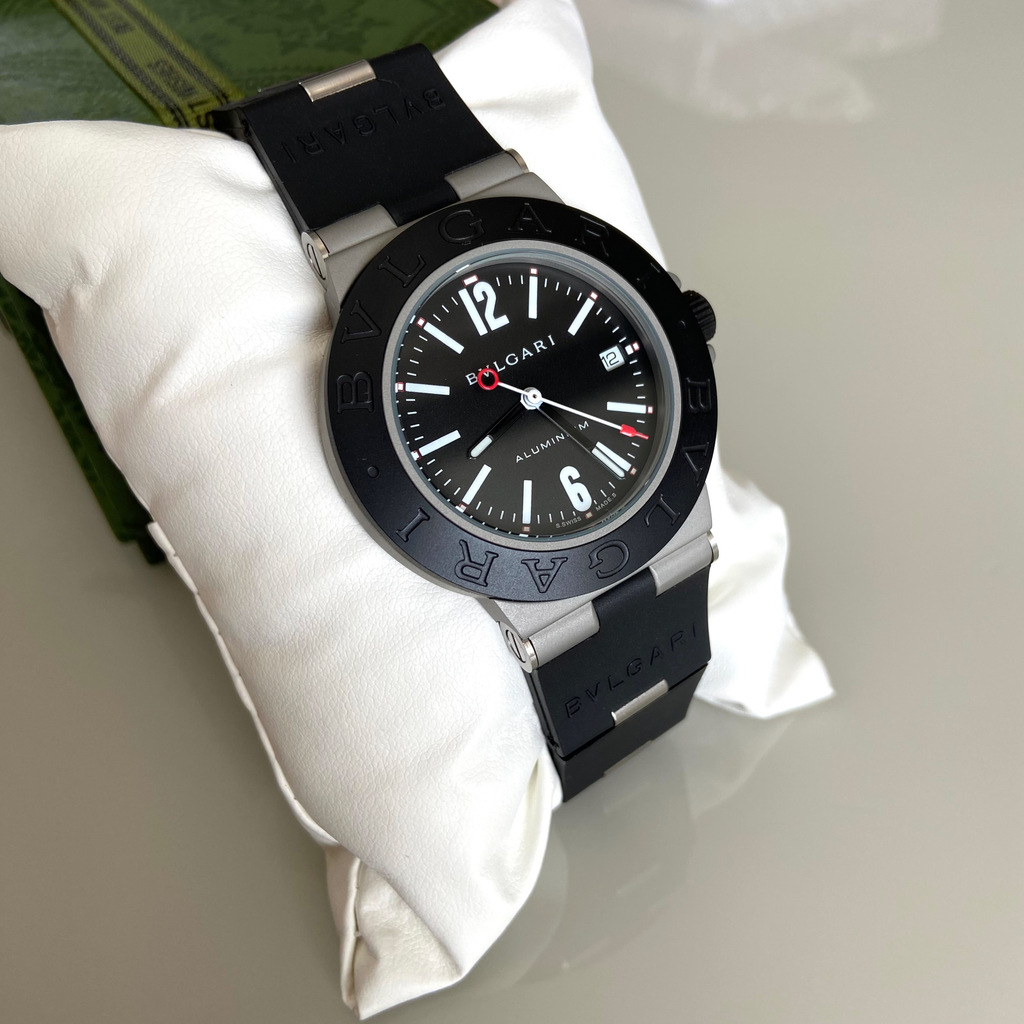 BVLGARI Aluminium automatico fundo preto, 40mm de diâmetro, todas as marcações e logos da Bvlgari, relógio rico em detalhes e acabamentos, vidro em safira, pulseira Bvlgari com ajustes em Aco inoxidavel (veste muito bem no pulso. Padrão devonwatch