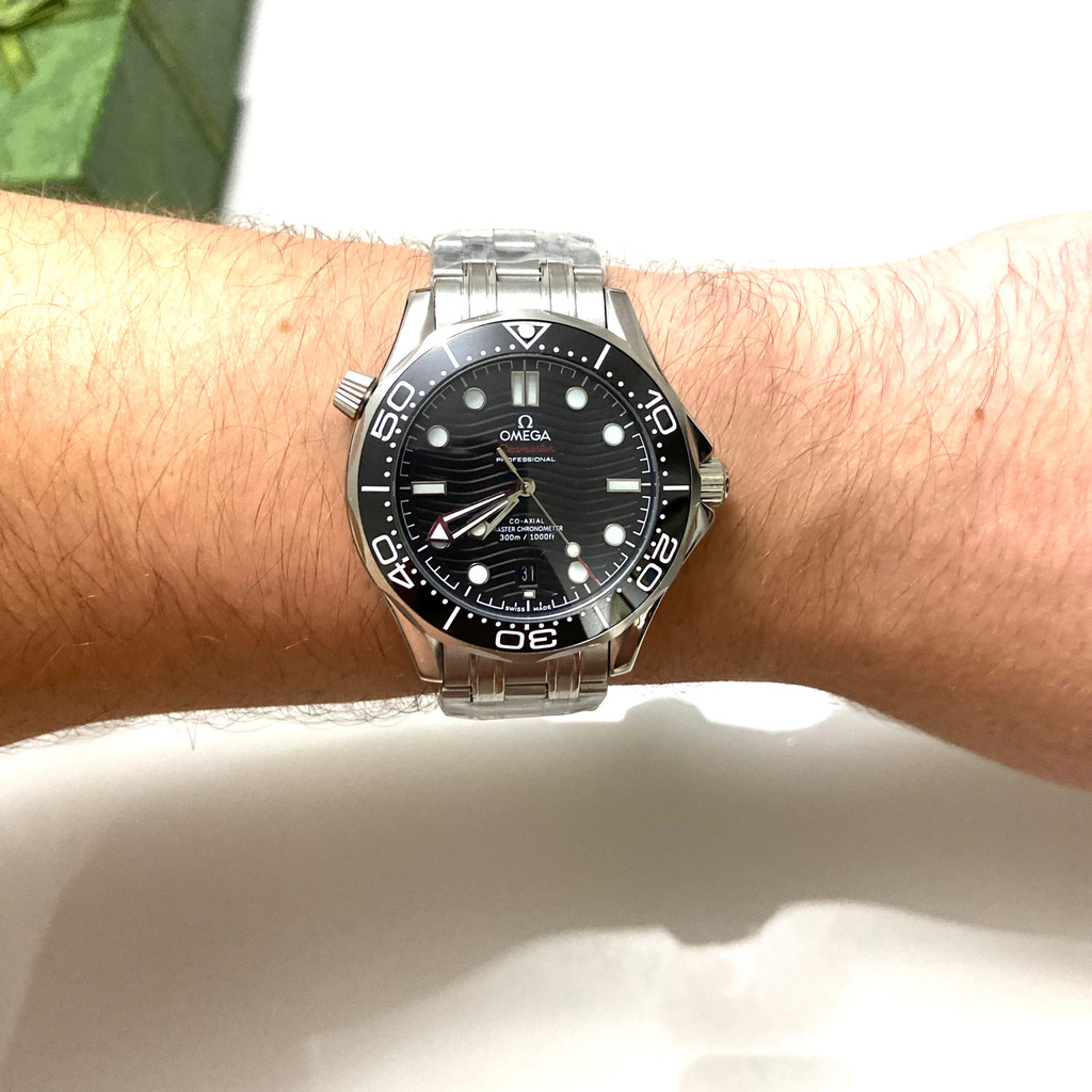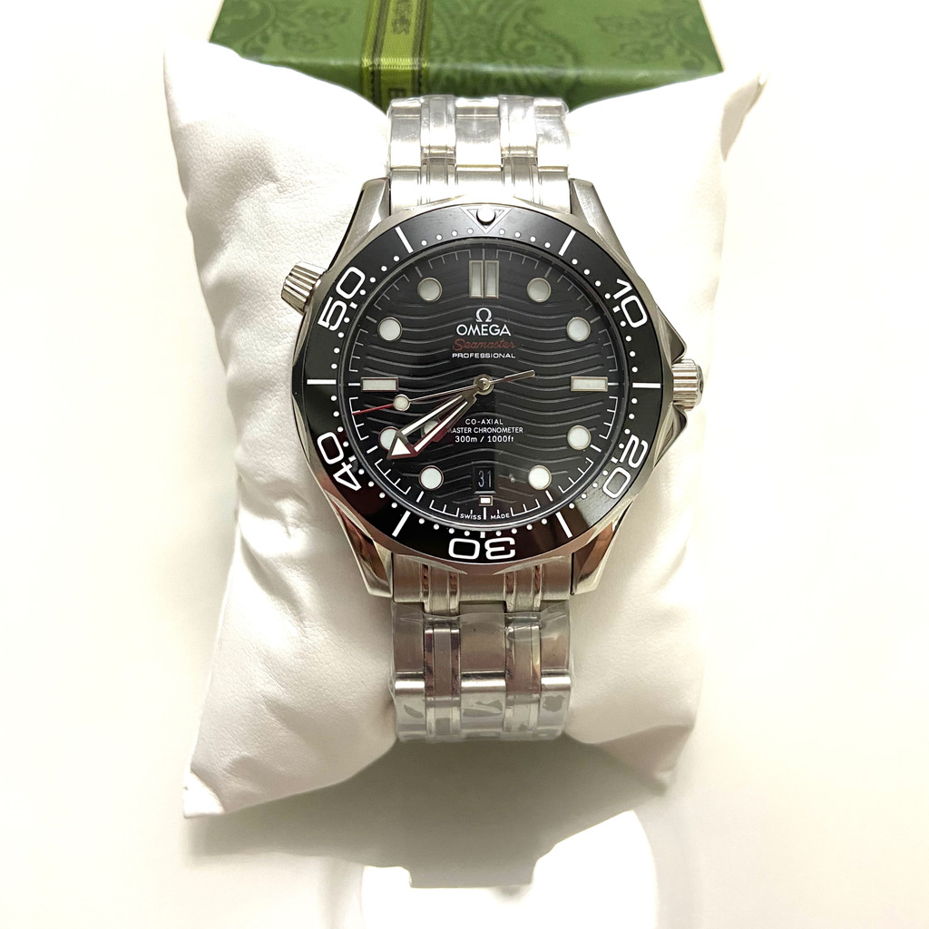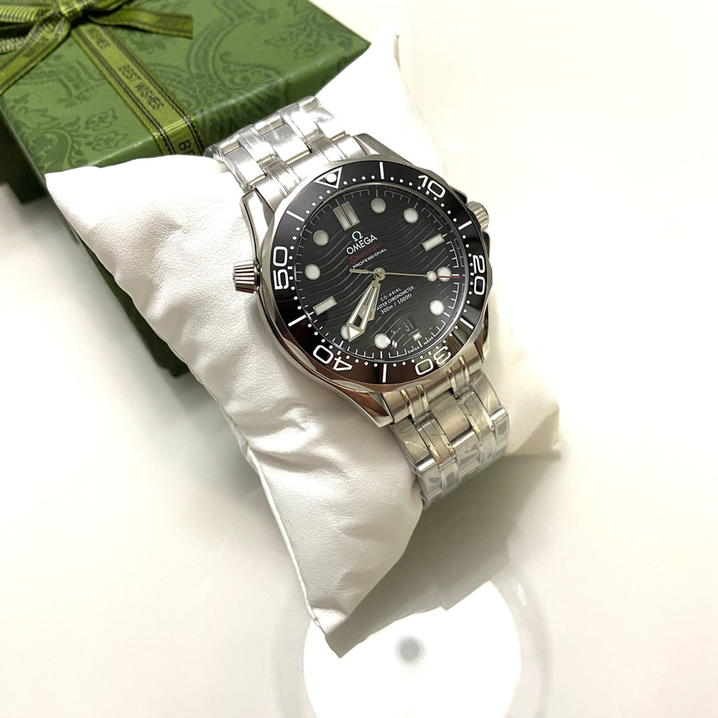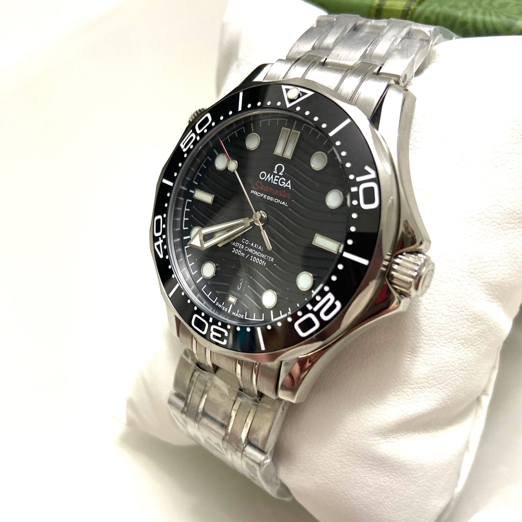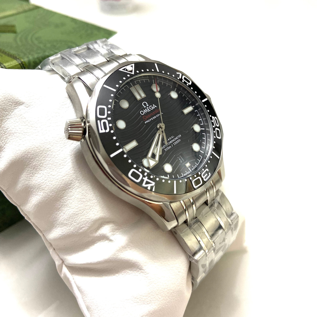 Omega seamaster diver automatico preto, todo em aço inoxidável, bezel em cerâmica com números grafiados, aproximadamente 41mm de diâmetro, todas as marcações e logotipos da omega, maquinario com data automatico (á mostra).